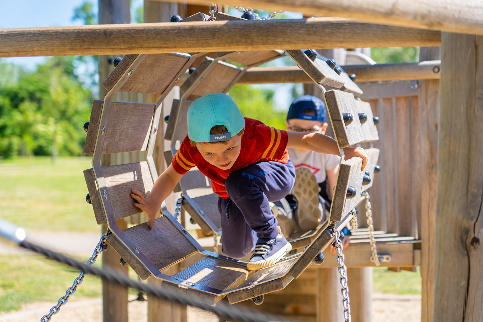 Pour offrir des sensations fortes aux enfants, privilégiez les parcours d’équilibre et les structures de jeux multifonctions sur votre aire de jeux !