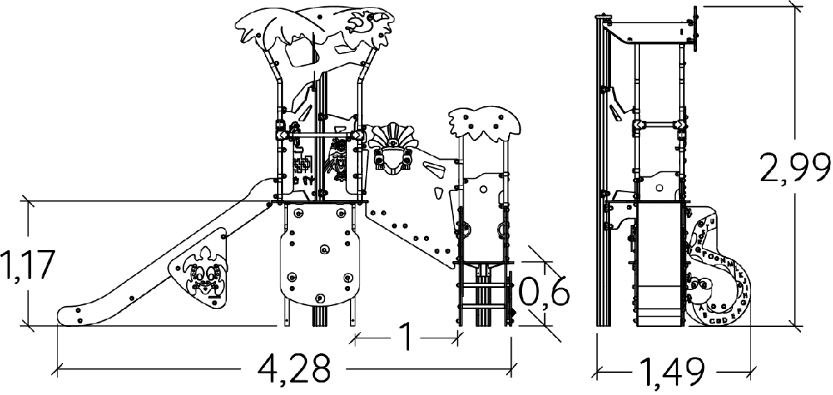 Les dimensions du module sont les suivantes : 4,28 m de longueur, 1,49 m de largeur, 2,99 m de hauteur. La hauteur de chute libre (HCL) est de 1,17 m.