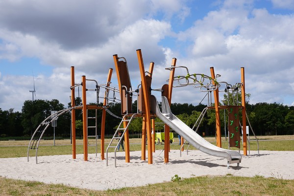 Structure multi-activités avec jeux d'équilibre et à grimper et toboggan coloris apparence bois - J5619-C®