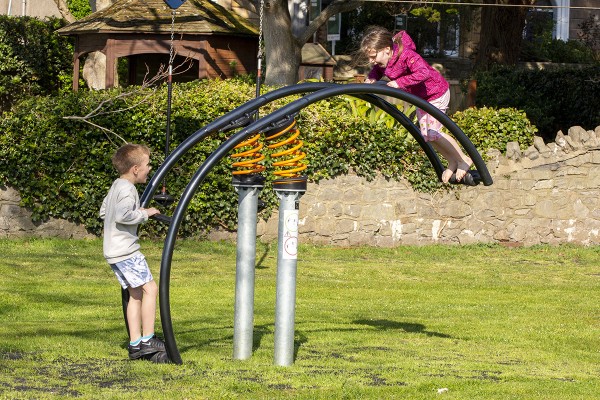 Jeu à bascule sur ressorts pour deux utilisateurs en position debout.